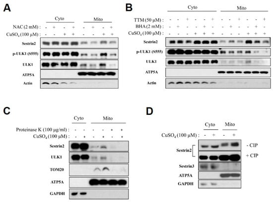 Cu is a transition metal and its metabolism is known to associate with ROS generation [,]. We wondered whether mitochondrial association of Sestrin2 could be ROS-dependent. We isolated cytosolic and mitochondrial fractions from HEK293 cells incubated with or without CuSO4 and evaluated mitochondrial association of Sestrin2. Additionally, the cells of interest were treated with antioxidant compounds: 2 mM N-acetyl cystenine (NAC) or 2 mM butylated hydroxyanisole (BHA), or 50 μM Cu chelator tetrathiomolybdate (TTM). Both antioxidants and a Cu chelator were effective in inhibiting mitochondrial association of Sestrin2, indicating that Cu-ROS damage is the likely underlying mechanism of Sestrin2-induced mitophagy in HEK293 cells (Figure 3A,B). Next, we examined the localization of mitochondria-bound Sestrin2. Gradient-purified mitochondria isolated from cells incubated with 100 μM CuSO4 or control cells were treated with exogenously added proteinase K and analyzed by immunoblotting. All mitochondria-associated Sestrin2 was degraded by proteinase K, whereas ATP5A remained protected, suggesting that Sestrin2 is mainly associated with the OMM, while ATP5A appears to be protected by the mitochondrial membranes (Figure 3C). Finally, we thought to determine if post-translational modifications such as phosphorylation could be involved in stress-induced association of Sestrin2 with mitochondria. Consistent with previous studies reporting that Sestrin2 is phosphorylated by ULK1 [], we observed changes in gel mobility of mitochondria-associated Sestrin2, indicative of phosphorylation. Importantly, these changes in electrophoretic mobility were reversed by treatment with calf intestinal alkaline phosphatase (CIP) (Figure 3D). We conclude that the phosphorylated form of Sestrin2 is associated with Cu-ROS-damaged mitochondria in HEK293 cells.