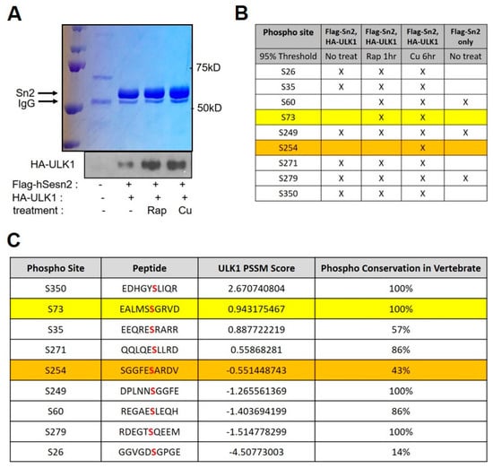 Ser-73 and Ser-254 are Cu-stress-specific phosphorylation sites of human Sestrin2 by ULK1 kinase. (A) Coomassie staining of FLAG-tagged human Sestrin2 (hSestrin2) and immunoblotting of HA-tagged ULK1 kinase after being treated with 100 nM rapamycin (Rap) for 1 h or 500 μM CuSO4 for 6 h in HEK293 cells. No treatment was used as a control. (B) Mass spectrometry analysis of phosphorylated hSestrin2 by ULK1 kinase from coomassie brilliant blue staining samples in (A). (C) In hSestrin2, ULK1 motif-matching scores and conservation were analyzed by bioinformatics analysis using the motif prediction program. Red letters in Peptide column indicate the specific residue of phosphorylation site (Phospho Site). A detailed algorithm can be found in the Methods Section.