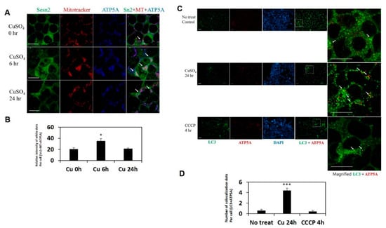 Next, we posited that endogenous ATP5A could bind to LC3 when phospho-Sestrin2 associates with damaged mitochondria as an induction signal (Figure S3). In line with this notion, we observed a robust colocalization of the endogenous ATP5A and the autophagosome protein LC3 in HEK293 cells challenged with CuSO4, but not with the uncoupler CCCP (Figure 5C,D). Although we have observed induction of Sestrin2 and some association of the protein with mitochondria upon treatment with 10 µM CCCP (Figure 2E), we had to use a 5-fold higher concentration of CCCP (50 µM) to ensure robust recruitment of Sestrin2 to mitochondria. We only observed strong colocalization of ATP5A and LC3 in CuSO4 treatment up to 24 h. These data suggest that the endogenous phospho-Sestrin2 can associate with mitochondria in both CuSO4- and CCCP-treated cells, however the ATP5A–LC3 association is more robust under the condition of Cu stress. In line with this notion, a very recent study reported that Sestrin2 can associate with mitochondria in CCCP-treated cells to promote mitophagy [] and our data firstly reported a Sestrin2 association with mitochondria to promote mitophagy in copper-treated cells.