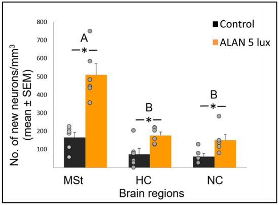 2.1. ALAN Increases New Neuronal Recruitment in the MSt, HC, and NC