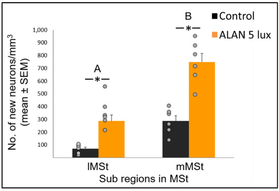 A further in depth analysis of the lateral (lMSt) and medial (mMSt) sub-regions of the MSt showed that ALAN significantly increased the number of new neurons recruited in both sub-regions (F(1,10) = 45.16, p < 0.0001; Figure 2). In brains of birds that were exposed to ALAN, the number of new neurons in the lMSt was 3-fold higher than in the controls, whereas in the mMSt it was 2.5-fold higher than controls (F(1,10.3) = 51.33, p < 0.0001 and F(1,11.7) = 34.28, p < 0.0001, respectively; Figure 2).