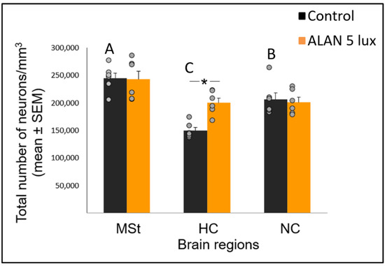 Following our observation that ALAN increased the number of new neurons that were recruited into all the three brain regions, we also recorded total neuronal densities in these regions (i.e., BrdU labelled and unlabeled neurons). Overall, there was a significant difference among the regions (F(2,14.5) = 47.56, p < 0.0001; Figure 3) and a significant group and brain region interaction (F(2,14.5) = 6.17, p = 0.0115). Total neuronal densities increased in the ALAN group compared to control only in the HC (F(1,10) = 9.638, p = 0.011), whereas no significant changes were observed in the MSt (F(1,10) = 0.13, p = 0.91) and NC (F(1,10) = 0.11, p = 0.75; Figure 3). In the control group, neuronal densities were significantly different between all the regions (F(2,9.7) = 96.856, p < 0.0005).