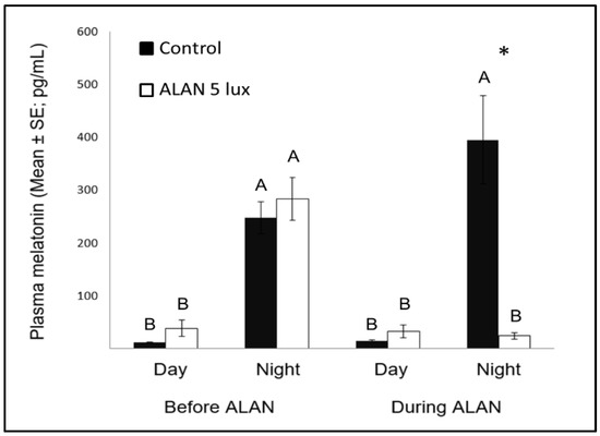 2.4. ALAN Reduces Nocturnal Melatonin Levels