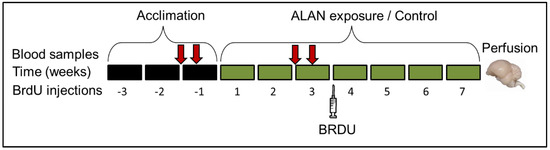 A schematic description of the overall experimental design is presented in Figure 5. Adult female zebra finches were reared in outdoor breeding colonies at the Meier Segals Garden for Zoological Research at Tel-Aviv University, Israel. They were banded with numbered plastic rings for individual identification. At 90–200 days of age the experimental birds were removed from their native colonies and randomly allocated into two groups of six birds each (see below) in standard cages (67 × 33 × 33 cm). For a 3-week acclimation period, birds were kept under controlled LD cycle (14:10 h) and temperature (27 °C) that correspond to mean outdoor Israeli August conditions. These conditions were chosen because we previously found that neuronal recruitment was higher in birds that were kept under August compared with February conditions [52]. Birds were exposed to full spectrum white daylight fluorescent lamp (CFL, Hyundai, Skopje, Macedonia) emitting 1200 lux at perch level during daytime, and to complete darkness during the night. Following the acclimation period, birds were kept for additional 7 weeks under the same daytime (August) conditions, but during the night either under complete darkness (control group); or under 5 lux emitted by a full spectrum compact white fluorescent lamp (Hyundai, Beijing, China) at perch level (ALAN group). Spectra of all bulbs were measured by a spectrometer (Jaz spectrometer, Ocean Optics, Largo, FL, USA) and intensities by a digital light meter (TES-1337, TES, Taipei, Taiwan). Plasma MEL levels were measured during the last week of the acclimation period and during the third week of the experimental period. At the end of the third experimental week, birds were treated with bromodeoxyuridine (BrdU, SigmaUltra, Sigma-Aldrich®, St. Louis, MO, USA), a cell birth-date marker, to label new neurons in their brains, and four weeks later birds were killed and their brains were perfused, as described below. Food (millet seeds) and water were provided ad libitum during the entire study. As an indirect indication of the birds’ health, each bird was weighted six times every 15 days (three times prior to and three times during ALAN exposure). This study was approved by the Tel-Aviv University Institutional Animal Care and Use Committee (permit No. 04-17-011, issued on 5 March 2017) and was carried out in accordance with its regulations and guidelines regarding the care and use of animals for experimental procedures. All chemicals were purchased from Sigma, Israel, unless otherwise stated.