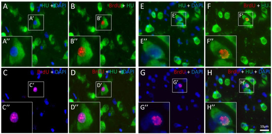 New neurons shown in microphotographs of the same field, (A–D) in the medial striatum (MSt); and (E–H) in the nidopallium caudale (NC) in the brain of a zebra finch (Taeniopygia guttata). HU staining (green) indicates neurons, BrdU staining (red) indicates nuclei of new neurons, and DAPI staining (blue) indicates cell nuclei. Overlapping of BrdU and DAPI staining is expressed as purple. Small frames (-′) indicate BrdU-HU co-labelled neurons, and big inserts (-″) are higher magnifications of these neurons. The scale of 10μm in H applies to A–H.
