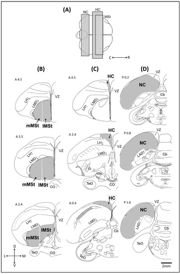 - Reiner, A.; Perkel, D.J.; Bruce, L.L.; Butler, A.; Csillag, A.; Kuenzel, W.; Medina, L.; Paxinos, G.; Shimizu, T.; Striedter, G.; et al. The avian brain nomenclature forum: Terminology for a new century in comparative neuroanatomy. J. Comp. Neurol. 2004, 473, E1. [Google Scholar] [CrossRef]