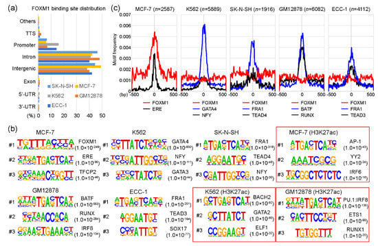 FOXM1 (Forkhead box protein M1) binding motif analysis. (a) Distributions of FOXM1 binding sites in SK-N-SH, MCF-7, K562, GM12878, and ECC-1 cell lines are shown, according to transcription termination site (TTS), promoter (+/− 2kb of the transcription start site), intron, intergenic, exon, 5′-unstranslated region (5′-UTR), and 3′-UTR. (b) Top three motifs identified with FOXM1 binding sites in a given cell line are shown. H3K27ac-enriched regions were used as control sets for the motif analysis of MCF-7, K562, and GM12878 cell lines (red boxes). (c) Motif frequencies of the top two motifs in each cell line were plotted according to the center of FOXM1 binding peaks.