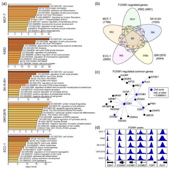 Molecular pathway prediction of FOXM1 target genes. (a) Gene ontology (GO) analysis was conducted using Metascape with the top 500 genes (ranked by the height of FOXM1 peaks) around the FOXM1 binding sites. (b) A Venn diagram shows the number of FOXM1 target genes identified in five cell lines. (c) A protein–protein interaction network was constructed with 89 common FOXM1-target genes among cell lines using NetworkAnalyst. (d) FOXM1 binding at promoters of the CDK1, CCNA2, CCNB1, CCNB2, FZR1, and PLK1 genes are shown.