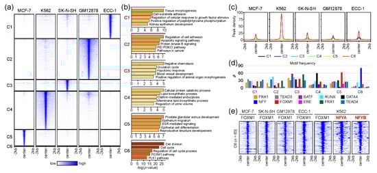 Comparative analysis of FOXM1 binding sites between cell lines. (a) The heatmap shows common (C6) and unique (C1–C5) clusters of FOXM1 binding sites between MCF-7, K562, SK-N-SH, GM12878, and ECC-1 cell lines. (b) Gene ontology (GO) analysis was performed using Metascape with the top 500 genes (ranked by the height of FOXM1 peaks) around the FOXM1 binding sites in each cluster. (c) The line plots show the average of the FOXM1 peak signal at the FOXM1 binding sites. (d) The bar plot shows the frequency of motif counts found at the FOXM1 binding sites of the clusters. (e) The heatmap shows binding profiles of given transcription factors on FOXM1 binding sites in the C6 cluster. NFYA and NFYB ChIP-seq were reanalyzed from a previous study (GSE26439) [29].