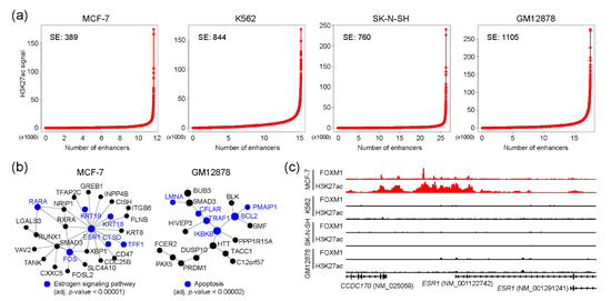 Super-enhancers (SEs) are the enhancers that contain clusters of enhancers and regulate cell-type-specific gene regulatory networks [30], and are therefore known to define cell identity and be associated with human diseases [31,32]. We wondered whether FOXM1 binding sites were also associated with SEs for controlling cell-type-specific gene regulatory programs in each cell type. To this end, SEs were identified in MCF-7, K562, SK-N-SH, and GM12878 cell lines using corresponding H3K27ac ChIP-seq with the ROSE algorithm [33]. ECC-1 was excluded from this analysis, due to the lack of a corresponding H3K27ac ChIP-seq sample in the ENCODE database. Totals of 389, 844, 760, and 1105 SEs were identified in MCF-7, K562, SK-N-SH, and GM12878 cell lines, respectively (Figure 4a and Table S5). Next, we pinpointed FOXM1 binding sites which were overlapped with SEs in each cell line. This analysis identified 401, 603, 226, and 1235 FOXM1 binding sites in MCF-7, K562, SK-N-SH, and GM12878 cell lines, respectively. To unveil potential functions underlying these FOXM1-associated SE-regulated genes, we conducted a PPI-based network analysis with the genes around the top 300 FOXM1 binding sites in each cell line. As expected, this analysis identified cell type-specific core PPI networks in the MCF-7 and GM12878 cell lines. Similar to the previous result (Figure 3b), the PPI network with proteins involved in the estrogen signaling pathway was the main PPI network in the MCF-7 cell line, and the ESR1 protein was predicted as the core protein controlling the other proteins in the network (Figure 4b). In fact, we found that a super-enhancer was located at the upstream of the ESR1 gene, and there were several FOXM1 binding sites located within the SE (Figure 4c). The results illustrate the connection between FOXM1 and SE in regulating target genes. In sum, our SE-based analysis also discovered that FOXM1 not only regulates cell cycle-related pathways, but is also responsible for cell type-specific pathways, possibly through SEs.