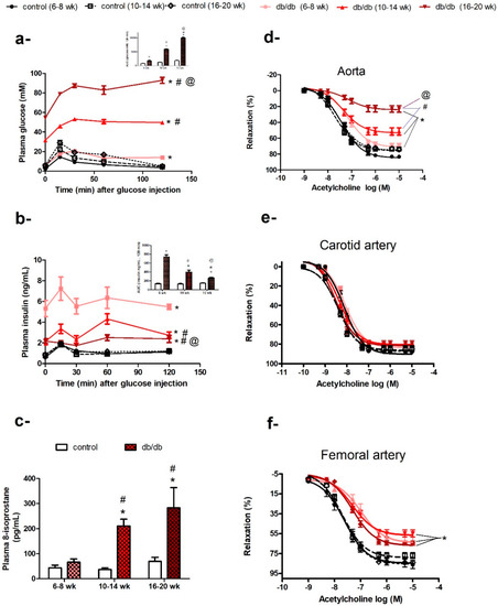 Age-related changes in diabetic status and endothelial dysfunction in db/db mice. Plasma glucose (a) and insulin (b) levels following an intraperitoneal injection of glucose in db/db and control mice at six, 10, or 16 weeks of age (n = 6–10; areas under the curve (AUCs) were compared by two-way ANOVA followed by Bonferroni post-test). (c) Histogram of plasma 8-isoprostane levels in db/db and control mice at six, 10, or 16 weeks of age (n = 5–10; two-way ANOVA followed by Bonferroni post-test). Cumulative concentration–response curves of acetylcholine in the aortae (d), carotid arteries (e), and femoral arteries (f) of db/db and control mice at 6–8 weeks, 10–14 weeks, and 16–20 weeks of age (n = 6–10 mice; two-way repeated-measures ANOVA followed by Bonferroni post-test). Results are expressed as mean ± standard error (SE). * denotes p < 0.05 vs. age-matched control, # denotes p < 0.05 vs. db/db (6–8 weeks), @ denotes p < 0.05 vs. db/db (10–14 weeks).