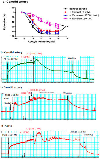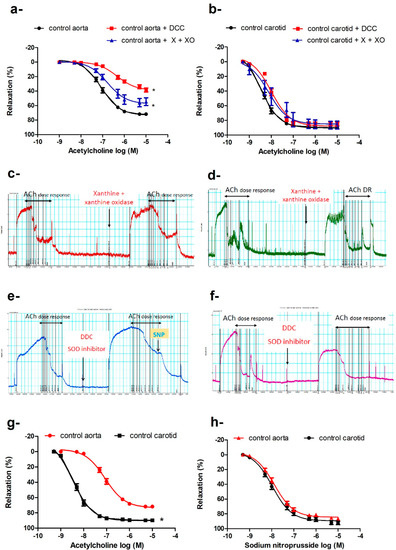 - Pagano, P.J.; Griswold, M.C.; Najibi, S.; Marklund, S.L.; Cohen, R.A. Resistance of endothelium-dependent relaxation to elevation of O(-)(2) levels in rabbit carotid artery. Am. J. Physiol. 1999, 277, H2109–H2114. [Google Scholar] [CrossRef]