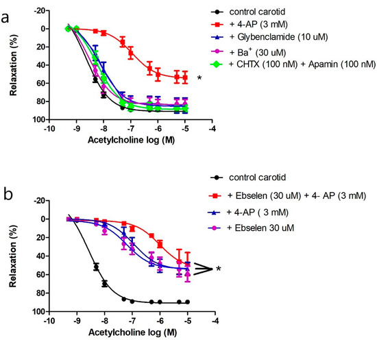 ROS regulates vascular tone by interacting with potassium channels [32,34,35]. Four types of potassium channels are expressed in the vasculature. We preincubated carotid arteries with 4-AP to inhibit KV, glybenclamide to inhibit KATP, barium chloride to inhibit Kir, or a combination of charybdotoxin and apamin to inhibit KCa. Only 4-AP impaired ACh-induced vasorelaxation in carotid arteries (Figure 4a).