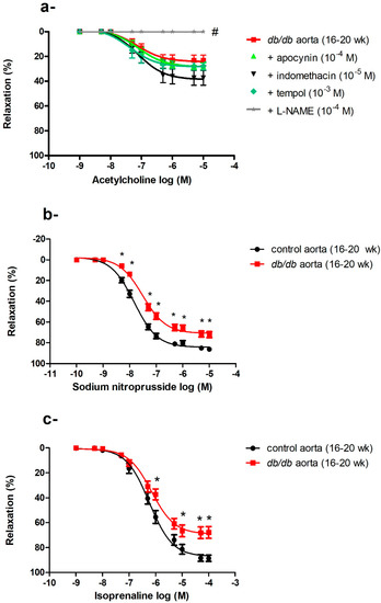 Generalized vascular dysfunction in in the aortae of db/db mice. (a) Effects of apocynin, indomethacin, L-NAME, and tempol on ACh-induced vasodilatation in the aortae of db/db mice at 16–20 weeks of age (n = 5–10 mice). (b) Cumulative concentration–response curves of sodium nitroprusside in the aortae of db/db mice at 16–20 weeks of age (n = 6–10 mice). (c) Cumulative concentration–response curves of isoprenaline in the aortae of db/db mice at 16–20 weeks of age (n = 5 mice). Values are displayed as mean ± SE. Dose–response curves were compared by two-way repeated-measures ANOVA followed by Bonferroni post-test. Emax was compared by one-way ANOVA. * denotes p < 0.05 vs. control aorta (16–20 weeks), # denotes p < 0.05 vs. db/db aorta (16–20 weeks).