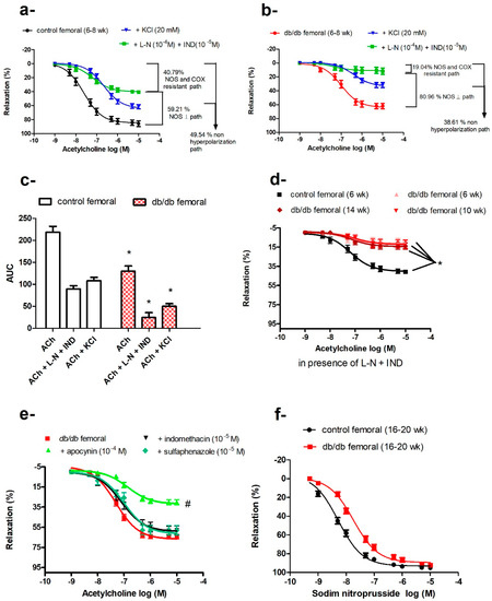 - Miike, T.; Kunishiro, K.; Kanda, M.; Azukizawa, S.; Kurahashi, K.; Shirahase, H. Impairment of endothelium-dependent ACh-induced relaxation in aorta of diabetic db/db mice--possible dysfunction of receptor and/or receptor-G protein coupling. Naunyn. Schmiedeberg’s Arch. Pharmacol. 2008, 377, 401–410. [Google Scholar] [CrossRef] [PubMed]