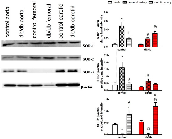 Protein expression of superoxide dismutase (SOD) isoforms in the aortae, as well as carotid and femoral arteries, of db/db (red filling) and control mice (white filling) (16–20 weeks old) (n = 4). Results are displayed as mean ± SE. Relative band intensities were compared by two-way ANOVA followed by Bonferroni post-test. * denotes p < 0.05 vs. control aorta, # denotes p < 0.05 vs. control femoral, @ denotes p < 0.05 vs. db/db aorta, α denotes p < 0.05 vs. db/db femoral artery. SOD = superoxide dismutase.
