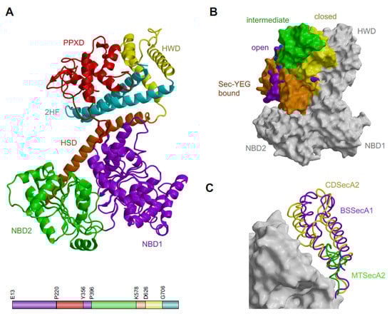 The crystal structure of apo CDSecA2 and conformational variability of SecA homologues. (A) The CDSecA2 crystal structure in closed conformation. Domains are color coded: violet, nucleotide-binding domain 1 (NBD1); green, nucleotide-binding domain 2 (NBD2); red, peptide cross linking domain (PPXD); orange, helical scaffold domain (HSD); cyan, two-helix finger (2HF) and yellow, helical wing domain (HWD). Locations of the domains in the linear sequence (bottom) define the color coding. The residues at the beginning of the domains are depicted. (B,C) The structures of different SecA molecules were superimposed onto CDSecA2 (PDB ID 6SXH) shown as white surface. (B) The colored surface of PPXDs in different conformations. Closed, intermediate and open conformations of CDSecA2 (PDB ID 6SXH), M. tuberculosis SecA2 (PDB ID 4UAQ) [23] and of B. subtilis SecA (PDB ID 3JV2) [19], are shown in yellow, green and violet, respectively. Sec-Y(EG) bound conformation of Thermotoga maritima SecA (PDB ID 3DIN) [24] is shown in orange. (C) The HWDs of different sizes presented as ribbons. Yellow, HWD of CDSecA2 (PDB ID 6SXH); violet, HWD of B. subtilis SecA1 (PDB ID 1M6N) [18] and green, HWD of M. tuberculosis SecA2 (PDB ID 4UAQ) [23].