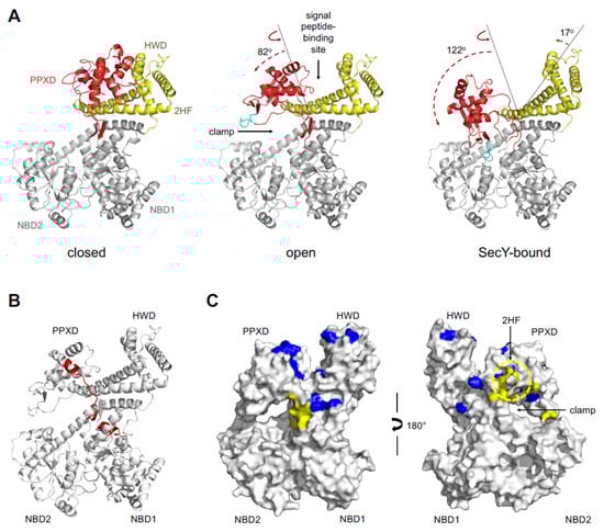 - Zimmer, J.; Rapoport, T.A. Conformational flexibility and peptide interaction of the translocation ATPase SecA. J. Mol. Biol. 2009, 394, 606–612. [Google Scholar] [CrossRef][Green Version]