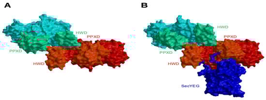 To summarize, the analyses presented here identified regions that contribute to the mechanism of SecA2-specific target recognition and interaction with the SecY channel. Our modeling exposed importance of the open conformation for formation of dimer, which can bind the SecY. An immediate suggestion from this study is that the locking PPXD domain in closed or transient conformation by a compound binding in the hinge region connecting PPXD domain to NBD1 may provide a new target site for drug discovery. Moreover, we were unable to find a template to model this region in the open conformation (Figure 3). This suggests that a ligand binding in that area may specifically inhibit the translocation of proteins in C. difficile SecA2 pathway, and due to the almost identical sequence in this regions, also its SecA1 homologue. Not so surprisingly, this further suggests that mechanistic differences between SecA1 and SecA2 should be studied pairwise. Nevertheless, our analysis (Figure 5) exposed lower sequence conservation in the CDSecA2 substrate loading region (encircled with blue line), and differences in 2HF finger, which pinpoint to further mutation studies to be tested in a substrate and SecY binding assay. Hence, we expect that the knowledge gathered in this study will enable us to address the question of how the SecA1 protein functions a part of the “housekeeping” export system in bacteria and, furthermore, how the SecA2 protein functions as a part of the translocation system for specific, possibly folded protein substrates [2,3,4,6,7,8,9,10,36].
