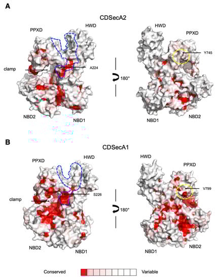 Next, we turned our attention towards specificity for substrate and SecY interactions. To expose the differences that might facilitate specific interactions, we performed evolutionary conservation analysis of their surfaces. We first prepared a model of CDSecA1 in the closed and open conformation using the SWISS-MODEL server [56], using the structures of Thermus thermophilus SecA (PDB ID 2IPC) [57] and B. subtilis SecA (PDB ID 3JV2) [19] as templates, respectively. Then, both open models, CDSecA2 and CDSecA1, and the SecA2 and SecA1 sequences from thirty different SecA2-encoding organisms were analyzed using the ConSurf server [58].