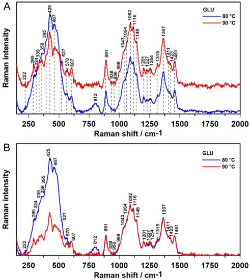 Raman spectra of 1,3-β-d-glucan matrices cross-linked at temperatures 80 °C and 90 °C are shown in Figure 4A. For a more consistent comparative evaluation, the 1,3-β-d-glucan spectra were normalized to a band at 1092 cm−1 (Figure 4B) attributed to the stretching CC and CO stretching modes [36]. The band at approximately 1148 cm−1 is assigned to C-O-C vibrations of the glycosidic bond [28]. The band at 1367 cm−1 is connected with angular deformation of the CH and COH groups [7]. The previously mentioned band at 1092 and shoulder band at ~1148 cm−1 are characteristic for β-glucans. Intense highly overlapped Raman 990–1200 cm−1 bandwidth comes from COC and CC stretching vibrations of polysaccharides. The bands in the 1200–1440 cm−1 spectral range mainly arise from in-plane ring deformation modes and OH and CH bending vibrations. Eventually, the band at 1461 cm−1 is attributed to CH2 in-plane bending in CH2OH of the molecule [7]. Table 2 contains the most important bands recorded in 1,3-β-d-glucan spectra.