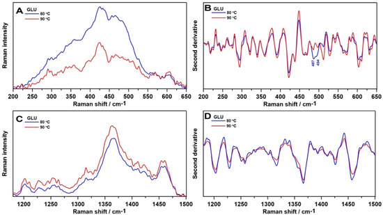 The biggest differences between the samples were noticed in the 200–650 cm−1 region (Figure 5A), which contributed to skeletal deformational and bending frequencies [7]. The 1,3-β-d-glucan sample gelled at 80 °C had higher Raman intensity. Moreover, in the second derivative course, two new bands were revealed: 487 cm−1 attributed to a skeletal distortion (CH def.) and 494 cm−1 ascribed to ring vibration of carbohydrates [37]. The range between 1180 and 1500 cm−1 is assigned to the conformation of the glycosidic linkages (1200–1300 cm−1) and CCH, OCH, COH, and HCH skeletal stretching [38]. There were no notable changes in the recorded spectra (Figure 5C) and inconsiderable minor shifts in second derivative course (Figure 5D). These may suggest different skeletal conformations in samples gelled at 80 °C. These results remain in accordance with FT-IR spectroscopic analysis.