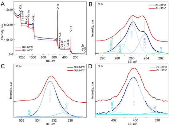 X-ray photoelectron spectroscopy was used to determine the chemical state of the surface elements in the studied samples. Figure 6 presents the full survey and core level spectra, respectively, of glucan samples gelled at 80 °C and 90 °C. In Figure 6A, in the wide scan spectra of the specimens the peaks at 285, 398, 533, 1070 and 345 eV for C, N, O, Na 1s and Ca 2s were detected [39].