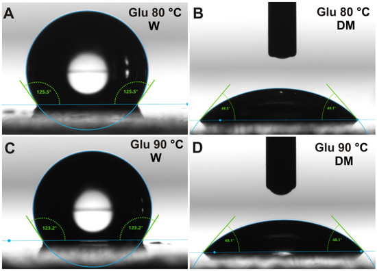 Images presenting water (W) (A,C) and diiodomethane (DM) (B,D) contact angle measurements for glucan matrices gelled at 80 °C (A,B) and 90 °C (C,D).