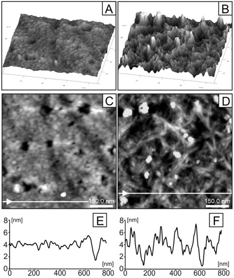 Figure 8 presents representative AFM images of GLU layers prepared at 80 and 90 °C (images: A, B (3D presentation) and: C, D (2D), respectively). Moreover, the presentation is supported by profiles of selected lines (E, F) marked by white arrows and lines in images (C, D). Comparison of microscopic observations evidently shows the important role of the preparation temperature on topological features of the investigated material. The surface of the samples prepared at the higher temperature (90 °C) are characterized, as expected, by a fibrous structure. In these cases, single fibers are easily distinguished on AFM images as bright lines. The width of the observed longitudinal structures are in the range 12–18 nm (however this dimension can be overestimated by the shape of the AFM tip). The fibers are randomly distributed and mutually intertwined. As a consequence the surfaces of these samples are relatively rough. They are additionally decorated by randomly distributed grains of sizes between 50–70 nm and high 5–10 nm (visible in the images as bright spots). The surface of the sample prepared at temperature 80 °C is, however, significantly different. The surface of this sample is much more smooth in comparison to the sample prepared at 90 °C (compare 3D images (Figure 8A,B) and line profiles (Figure 8E,F). This observation indicates that the fibers in the layer prepared at 80 °C are significantly more densely packed. The characteristic features of this surface are randomly distributed pores of the size in the range 30–70 nm (visible in image Figure 8C as dark spots).