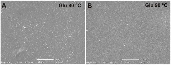 Surface morphology of the glucan matrices gelled at different temperatures was also visualized by SEM. The performed observation confirmed higher roughness of the glucan matrix gelled at 90 °C compared to the sample heated at 80 °C (Figure 9). Surface morphology of the sample gelled at 90 °C was characterized by noticeably greater granulation compared to the sample gelled at lower temperature.