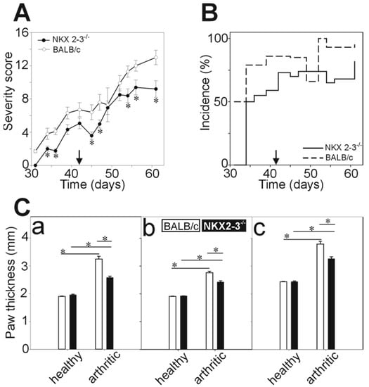 Since Nkx2-3 knock-out mice were present with severe splenic developmental defects, we were curious to test whether rhG1-induced arthritis could be observed in them. To this end, we immunized Nkx2-3−/− and wild-type control BALB/c mice side-by-side. Nkx2-3−/− mice developed arthritis; however, to a lesser extent than the control BALB/c mice indicated by both the lower clinical severity scores (9.2 ± 1.0 in Nkx2-3−/− versus 13.0 ± 0.9 in BALB/c controls at Day 61) (Figure 1A) and the lower incidence (~70% in Nkx2-3−/− versus >90% in BALB/c controls after the third immunization) (Figure 1B). The clinical scores were supported by the limb thickness measurements, too. We measured the wrist (Figure 1(Ca)), leg (Figure 1(Cb)) and ankle (Figure 1(Cc)) thickness two weeks after the third immunization. We found that in arthritic Nkx2-3−/− mice, the limbs were significantly less swollen (Figure 1(Ca–Cc)) indicating a lower degree of inflammatory edema. Interestingly, in Nkx2-3−/− mice, the disease progression was also different from that seen in BALB/c mice: in GIA, typically, the arthritis develops progressively and once established it will not regress, however, in the case of Nkx2-3−/− mice we have seen the undulation of paw inflammation in some cases.