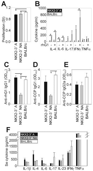 Antibody production is an important laboratory parameter of GIA correlating with the severity of the disease []. So, after the characterization of the cellular immune response, we went on to measure the joint inflammation-related serum antibody levels of Nkx2-3−/− and BALB/c mice. We found significantly decreased anti-rhG1 (Figure 3C) and anti-CCP (Figure 3D) IgG1 levels in the nonarthritic Nkx2-3−/− mice sera compared to the arthritic BALB/c controls. The arthritic Nkx2-3−/− mice had similar levels of anti-rhG1 (Figure 3C) and anti-CCP (Figure 3D) IgG1 to the arthritic BALB/c mice. Furthermore, the anti-CCP-IgG2a levels were lower (but not significantly) in both arthritic and nonarthritic Nkx2-3−/− mice than in arthritic BALB/c controls (Figure 3E). In line with our expectations, we found that the sera of nonarthritic Nkx2-3−/− mice contained lower levels of anti-rhG1 and anti-CCP IgG1 when compared to the arthritic Nkx2-3−/− sera (Figure 3C,D). In contrast, there was no significant difference between the anti-CCP IgG2a levels of the sera from arthritic or nonarthritic Nkx2-3−/− mice (Figure 3E).