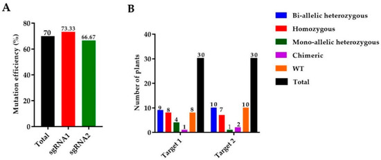 Identification of mutations generated by the clustered regularly interspaced short palindromic repeats/CRISPR-associated protein 9 (CRISPR/Cas9) system. (A) The mutation efficiency of sgRNAs (single guided RNAs), (B) The mutation rate in T0 (Transgenic) generation, (C) sequencing chromatograms of WT (wild type) and homozygous mutant lines for Target 1 and Target 2, and (D) the alignment of sequences for T1, T2, and T3 generations, respectively. The target sequence is painted in yellow, while the PAM (protospacer adjacent motif) is in the green background, and insertions/deletions are represented by red hyphens and letters. The analysis was carried out in three replications for each line.