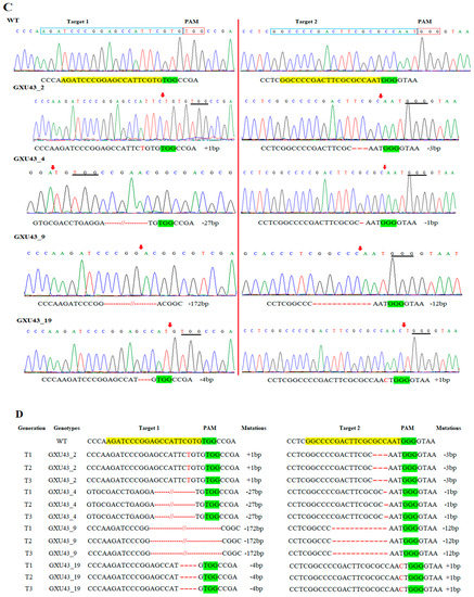 We selected four transgene-DNA-free (T-DNA-free) homozygous lines (GXU43_2, GXU43_4, GXU43_9, and GXU43_19) for agronomic traits evaluation. GXU43_2 showed homozygous mutations with 1 bp insertion and 3 bp deletion, the mutant GXU43_4 showed 27 bp and 1 bp deletions, the homozygous mutant GXU43_9 revealed 172 bp and 12 bp deletions, and finally, the homozygous mutant line GXU43_19 resulted in 4 bp deletion and 1 bp insertion on the first and second target sites, respectively. The sequencing analysis of these homozygous mutants showed that the mutations were stable and inheritable in T1, T2, and subsequent T3 generations (Figure 1D). The plant numbers and the corresponding mutations in both target sites are mentioned in Supplementary file 1, Table S2. The thirty plants were selected, and the DNA was amplified for 5 loci of each target site with the highly ranked off-target potential, and no secondary off-target mutations were detected in sequencing results (Supplementary file 1, Table S3).