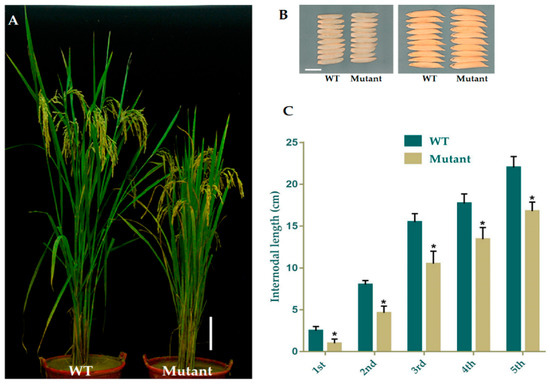 Phenotypic appearance of OsGA20ox2 in GXU43_9 and WT. (A) Plant height of mutant lines and WT after the heading stage. Bar = 15 cm. (B) Grain phenotype of mutant line and WT; Bar = 5 mm. (C) The lengths of internodes in mutant line and WT. The “*” denotes the significant difference at p < 0.01. Values are means ± standard deviation (SD) (n = 10 plants).