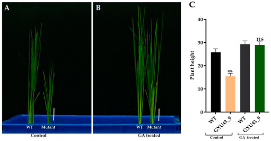 The seedling phenotype of the homozygous mutant GXU43_9 and WT. (A) Seedlings phenotype without GA, (B) Seedlings treated with GA, and (C) PH (plant height)of GA3-treated and control (n = 15), Bars = 3 cm. Data are mean ± SD. “**” and “ns” represent a significant and non-significant difference respectively at p ≤ 0.01.