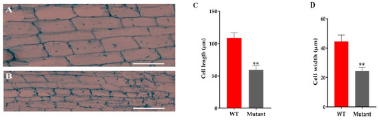 The microscopic analysis of the culm cell of mutant line GXU43_9 showed irregularly shaped cells with thin walls, significantly smaller in size, and an increase in cell layers was observed as compared to WT (Figure 4A,B). From these results, we can conclude that the development of the stalk was affected in GXU43_9. The length and width of the cells in mutants was significantly smaller as compared to WT (Figure 4C,D).