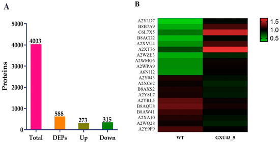 Proteomic analysis information of the CRISPR mutant GXU43_9 and its WT. (A) Upregulated and downregulated differentially expressed proteins (DEPs), and (B) Heatmap of the top twenty DEPs. Red color denotes the higher while the green color represents a lower level of expression.