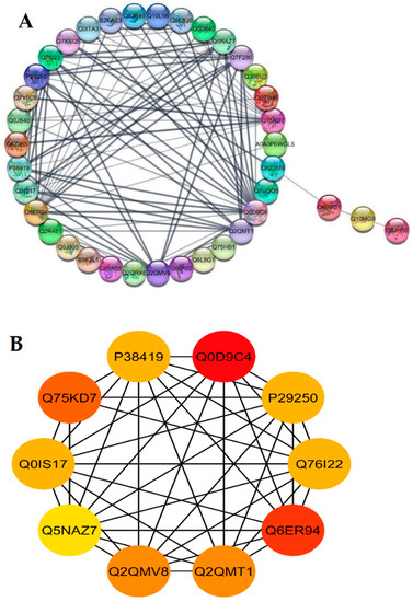 Functional networks of DEPs and hub-protein analysis of WT and mutant line GXU43_9. (A) STRING software predicted proteins’ associations. The nodes represent differentially expressed proteins, while the edge denotes the interaction relationship between the nodes. (B) The top hub-proteins of WT and GXU43_9 comparison. The higher co-expression is denoted by red color.