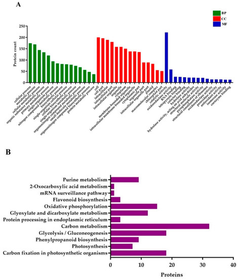 Gene ontology (GO) and KEGG (Kyoto Encyclopedia of Genes and Genomes) pathway enrichment analysis of DEPs. (A) GO annotations of the DEPs, and (B) the histogram of KEGG pathway enrichment, with the bar showing the number of proteins. BP; biological processes, CC; cellular components, and MF; molecular functions.