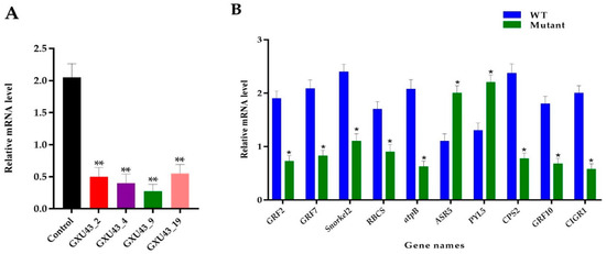We applied 10 μM GA3 to analyze the response of mutant and WT plants at the seedling stage. The data for plant height was recorded after 25 days. The mutant plants responded to exogenous GA3 significantly and restored the PH identically to that of the WT (Figure 3A,B). The homozygous mutant line GXU43_9 exhibited the lowest PH (15.52 cm) in controlled conditions as compared to the PH of wild type plants (25.85 cm), which was significantly higher than the mutant plants. Under the GA3 application, the T1 mutant line GXU43_9 restored the PH (28.95 cm), nearly equal to that of WT plants (29.24 cm). These results clearly show that the GA3 application promoted the growth of WT and mutant plants (Figure 3C).