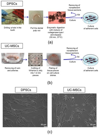 Accumulating evidence indicates that the dental pulp contains a unique population of adherent cells with mesenchymal characteristics, including adhesion to plastic surfaces, fibroblast-like morphology, lack of expression of CD14, CD34 or CD45 and potential to differentiate into osteoblasts in vitro [18,43]. Thus, in the current study, we developed and optimized the protocol for the isolation of such cells with the corresponding characteristics of MSCs (Figure 1a). The dental pulp extracted from the permanent teeth of healthy human donors was subjected to enzymatic digestion to isolate a mixture of different populations of cells, which were further seeded on cell culture plates. After 10 days, we obtained a population of adherent cells that were proliferated further. Moreover, we also isolated UC-MSCs from human UC Wharton’s Jelly tissue (Figure 1b) by employing a similar approach, which were used as a “classic” control MSCs for comparison with the dental pulp- derived cells in vitro.