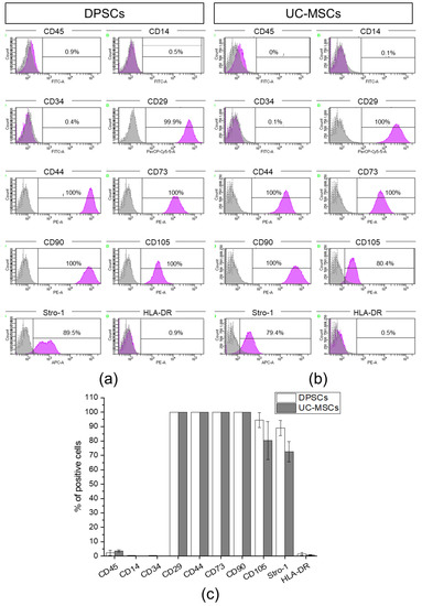 Antigenic profile of DPSCs and UC-MSCs with flow cytometry. Expression of MSC-negative markers (D45, CD14, CD34), MSC- positive markers (CD29, CD44, CD73, CD90, CD105, Stro-1), and HLA-DR antigen on DPSCs and UC-MSCs. (a) Representative histograms of the expression of analysed antigens on DPSCs. (b) Representative histograms of the expression of analysed antigens on UC-MSCs. The peaks of unstained cells (grey) were overlaid with the peak for analysed antigen (violet). (c) Quantitative data representing the percentage content of DPSCs or UC-MSCs positive for analysed antigens. Results are presented as mean ± SD, n = 3.