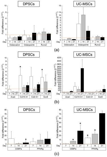 Comparison of tri-lineage differentiation potential of DPSCs and UC-MSCs by real-time RT-PCR. (a) Quantitative analysis of mRNA expression for osteogenesis related genes (osteocalcin, osteopontin, Runx2) in DPSCs (left) and UC-MSCs (right). (b) Quantitative analysis of mRNA expression for chondrogenesis related genes (Acan, Col10A1, Col2A1, Sox9) in DPSCs (left) and UC-MSCs (right). (c) Quantitative analysis of mRNA expression for adipogenesis related genes (CEBPα, PPARγ) in DPSCs (left) and UC-MSCs (right). Cells were cultured in a StemPro osteogenesis differentiation kit, StemPro chondrogenesis differentiation kit, and StemPro adipogenesis differentiation kit for 7, 14, and 21 days, respectively. Fold differences in expression (2−ddCt) of analysed genes in control cells cultured in standard cell culture medium (undifferentiated) were calculated as 1.0 and marked by a solid line. Graphs present different scales. Results are presented as mean ± standard error of the mean (SEM), n = 3 (every sample prepared for each DPSCs line derived from each donor were run in duplicates); t-test, (*) p < 0.05 vs. undifferentiated cells.