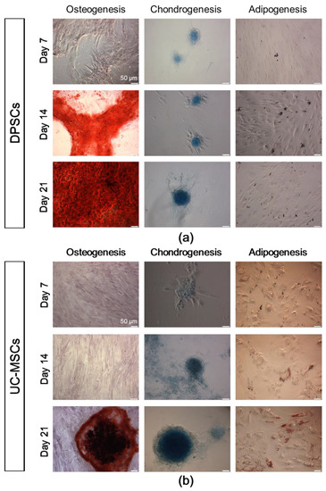 Tri-lineage differentiation potential of DPSCs and UC-MSCs in an in vitro culture demonstrated by histochemical staining. (a) Representative images of DPSCs differentiated into osteoblasts, chondroblasts and adipocytes. (b) Representative images of UC-MSCs differentiated into osteoblasts, chondroblasts, and adipocytes. DPSCs and UC-MSCs were cultured in a StemPro osteogenesis differentiation kit, StemPro chondrogenesis differentiation kit, or StemPro adipogenesis differentiation kit. On days 7, 14, and 21 of differentiation, DPSCs and UC-MSCs were fixed with paraformaldehyde and stained with Alizarin Red S (red staining of calcium phosphate deposits that are a characteristic of osteogenic differentiation), Alcian Blue (blue staining of sulphated proteoglycans that are a characteristic of chondrogenic differentiation) or Oil Red O (brownish red oil droplets that are a characteristic of adipogenic differentiation). Scale bars: 50 µm.