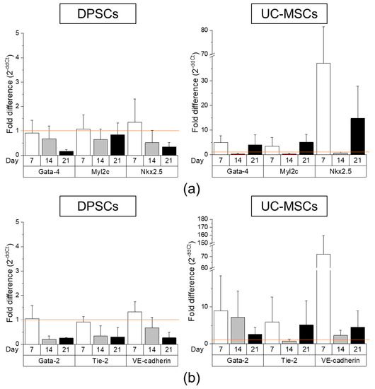 Comparison of cardiomyogenic and endothelial differentiation potential of DPSCs and UC-MSCs by Real-Time PCR. (a) Quantitative analysis of mRNA expression of cardiomyogenesis related genes (Gata-4, Nkx2.5, Myl2c) in DPSCs (left) and UC-MSCs (right). Cells were cultured in DMEM/F12 supplemented with 2% FBS and 10 ng/mL basic fibroblast growth factor (bFGF), 10 ng/mL vascular endothelial growth factor (VEGF) and 10 ng/mL transforming growth factor β1 (TGF-β1) for 7, 14 and 21 days. (b) Quantitative analysis of mRNA expression for endothelial related genes (Gata-2, Tie-2, VE-cadherin) in DPSCs (left) and UC-MSCs (right). Cells were cultured in EGM-2MV endothelial cell growth medium for 7, 14 and 21 days. Fold differences in the expression (2−ddCt) of analysed genes in control cells cultured in standard cell culture medium (undifferentiated) were calculated as 1.0 and marked by a solid line. Graphs present different scales. Results are presented as mean ± SEM, n = 3 (every sample prepared for each DPSCs line from each donor was run in duplicate); t-test, p < 0.05 vs. undifferentiated cells.