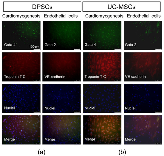 Cardiomyogenic and endothelial differentiation of DPSCs and UC-MSCs in vitro on day 7. (a) Representative images of cardiomyogenic and endothelial marker expression in DPSCs. (b) Representative images of cardiomyogenic and endothelial marker expression in UC-MSCs. In the case of cardiomyogenic differentiation, cells were cultured in DMEM/F12 supplemented with 2% FBS and 10 ng/mL bFGF, 10 ng/mL VEGF and 10 ng/mL TGF-β1. On day 7, cells were fixed, permeabilized, and stained against intranuclear transcription factor Gata-4 (Alexa Fluor 488, green) and troponin T-C (Alexa Fluor 546, red), whereas nuclei were co-stained with DAPI (blue). In the case of endothelial differentiation, cells were cultured in EGM-2MV. On day 7, cells were fixed, permeabilized, and stained against intranuclear transcription factor Gata-2 (Alexa Fluor 488, green) and VE-cadherin (Alexa Fluor 546, red), whereas nuclei were co-stained with DAPI (blue). Cells were analysed with Leica DMI6000B ver. AF7000 fluorescent microscope. Scale bars: 100 μm.