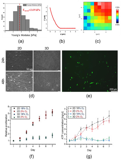 We further observed that the DPSCs encapsulated in the 3D hydrogel exhibited a round shape 24 h post mixing, whereas certain flattened cells exhibiting a spindle-shaped morphology were observed after 48 h, indicating a phenotypical change. In contrast, DPSCs seeded on cell culture plates (2D) exclusively exhibited spindle-shaped morphology at both time points as expected in standard 2D conditions (Figure 7d,e). On the first day of 2D and 3D cultures, the relative proliferation of DPSCs in an environment containing 2% or approximately 18% of O2 was the same (Figure 7f). Between days 2 and 7 after culture initiation, we observed a greater relative proliferation of DPSCs in 2D culture compared to that in the 3D culture. However, we did not observe any influence of O2 concentration on the proliferation ratio of DPSCs in both 2D and 3D culture conditions at fixed-time intervals (Figure 7f). The increased proliferation of DPSCs in 2D culture was correlated with the higher metabolic activity of these cells (Figure 7g). DPSCs in 3D culture exhibited lower metabolic activity along with their lower proliferation. We also did not observe any significant impact of O2 concentration on the levels of ATP production in DPSCs in 2D and 3D cell culture (Figure 7g).