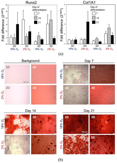 Osteogenic differentiation of DPSCs encapsulated in hydrogel (3D) or seeded on the surface coated with gelatin (2D) cultured in hypoxic (2% O2) or normoxic (about 18% O2) environment. (a) Quantitative analysis of mRNA expression for osteogenesis associated genes (Col1A, Runx2) in DPSCs on days 7, 14, and 21 of differentiation. Fold change in the expression of analysed genes in control cells before differentiation was calculated as 1.0 and marked by a solid line. Results are presented as mean ± SEM, n = 3 (every sample was analysed in duplicate). p < 0.05 (t-test). (b) Representative images of DPSCs differentiated into osteoblasts on days 7, 14, and 21 days of differentiation. Panel “Background” contains the representative images of 2D and 3D surfaces (standards plastic dish and hydrogel without cells, respectively) stained with Alizarin Red S solution to visualize background staining (on day 7 post surface preparation). Panels “Day 7”, “Day 14”, “Day 21” demonstrate representative images of DPSCs cultured in StemPro osteogenesis differentiation kit. On days 7, 14 and 21, DPSCs were fixed with paraformaldehyde and stained with Alizarin Red S (red staining of deposits of calcium phosphate is a characteristic for osteogenic differentiation).