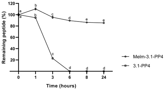 One of our main motivations to explore IL-peptide conjugates concerns improving the enzymatic stability of the peptide moiety, as poor pharmacokinetics is a major obstacle towards clinical translation of AMP and other bioactive peptides, even when topical applications are envisaged. For instance, in a non-healing infected wound, peptides are vulnerable to modification by endogenous (e.g., tyrosinase, elastase, metalloproteinases) and exogenous (produced by colonizing microbes) enzymes in the wound site [23]. Peptide 3.1-PP4 and derivatives thereof are under investigation for topical applications on infected skin lesions; thus, to evaluate how the conjugation of an IL to 3.1-PP4 could affect the enzymatic stability of this peptide, we incubated both the conjugate and the parent peptide with tyrosinase, due to its central role in melanin biosynthesis in the skin [24], and reported increased levels in the course of wound healing [25]. The choice of this particular enzyme may seem odd at a first glance, as the 3.1-PP4 sequence lacks tyrosine residues, whereas tyrosinase is best known for promoting oxidation of phenols like, e.g., the side chain of tyrosine [25]. However, recent evidence of proteolytic activity for tyrosinase, with an apparent preference for hydrophobic amino acids, e.g., isoleucine, at the cleavage site [26], stimulated our interest in investigating whether our leucine-rich peptide would be a substrate for this enzyme of undeniable relevance in skin and wound healing. Hence, both parent peptide and its ionic liquid conjugate were incubated at 37 °C and pH 6.8 in the presence of the enzyme, and in its absence as a control. The samples were collected at different time points, for 24 h, and were analyzed by HPLC. Results are presented in Figure 2, where the complete degradation, within 6 h, of peptide 3.1-PP4 confirmed it as a substrate for tyrosinase, despite being devoid of tyrosine or any other phenol or polyphenol moieties. Additionally, about 84% of the IL-peptide conjugate MeIm-3.1-PP4 remained unaltered after 24 h, demonstrating the remarkable gain in stability afforded by conjugation of the IL to the N-terminus of the parent peptide. Both controls remained unchanged at the end of the experiment (data not shown).